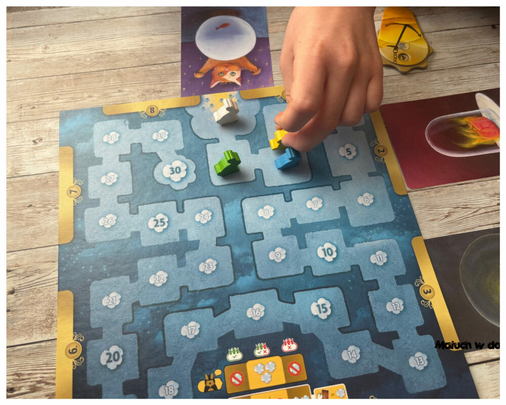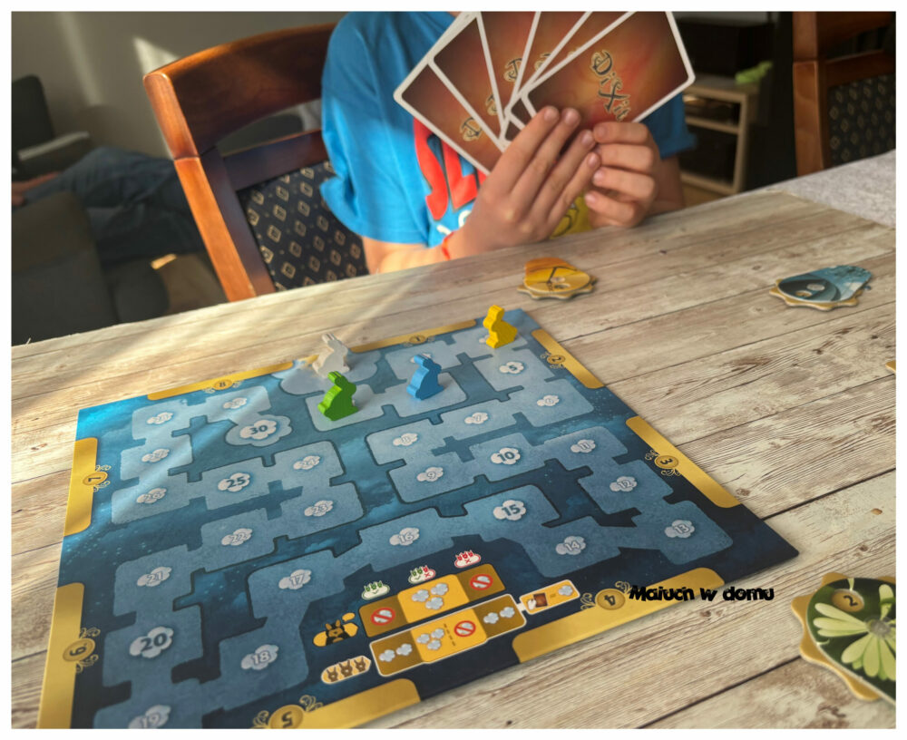 Uczestnicy gry przesuwają swoje króliczki o liczbę pól odpowiadającą ilości zdobytych punktów.