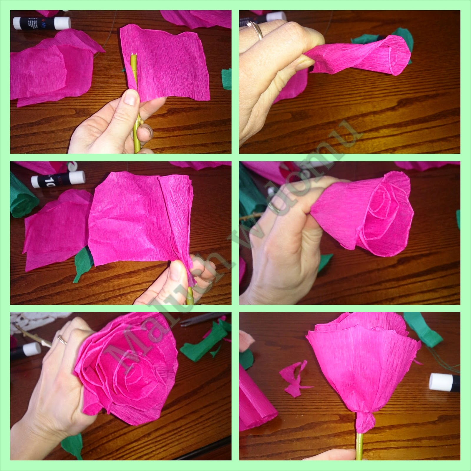 Płatki okręcamy po kolei wokół patyka. Można kleić, albo na końcu związać nitką. Żeby róża ładnie wyglądała potrzeba min. 11 płatków, ja użyłam 16.