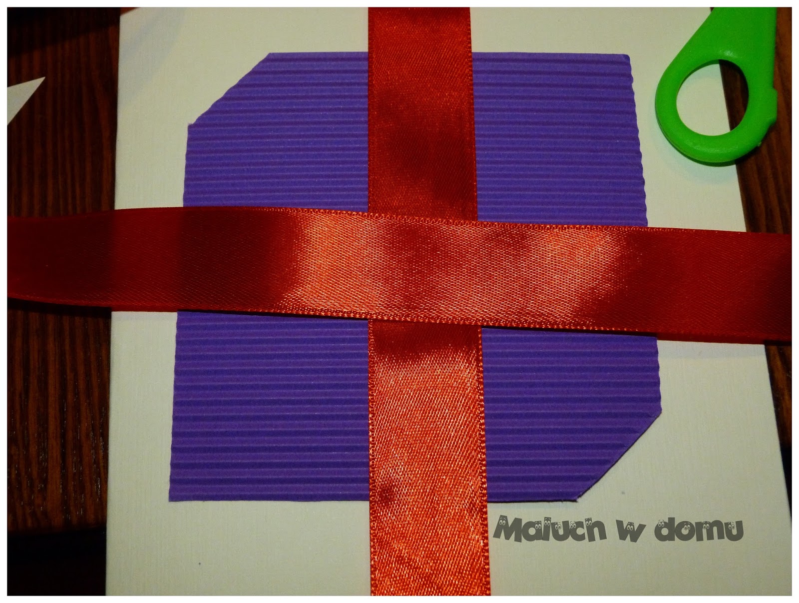 Kokardkę mocujemy na prezencie i całość przyklejamy na kartce.