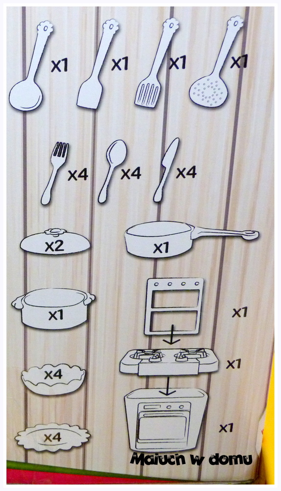 Według danych producenta (znajdujących się na opakowaniu) zestaw Party World – Kuchnia składa się z 31 elementów, aczkolwiek nasz ma ich więcej, więc nie wiem czy to błąd w druku, czy mieliśmy farta 🙂