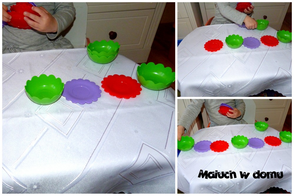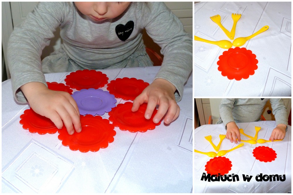 Układamy wzór wykorzystując naczynia i sztućce, tym sposobem zmuszamy dziecko do logicznego myślenia i dalszego układania według określonego schematu. Ważny jest też kierunek czy sposób ułożenia np. łyżki czy noża.