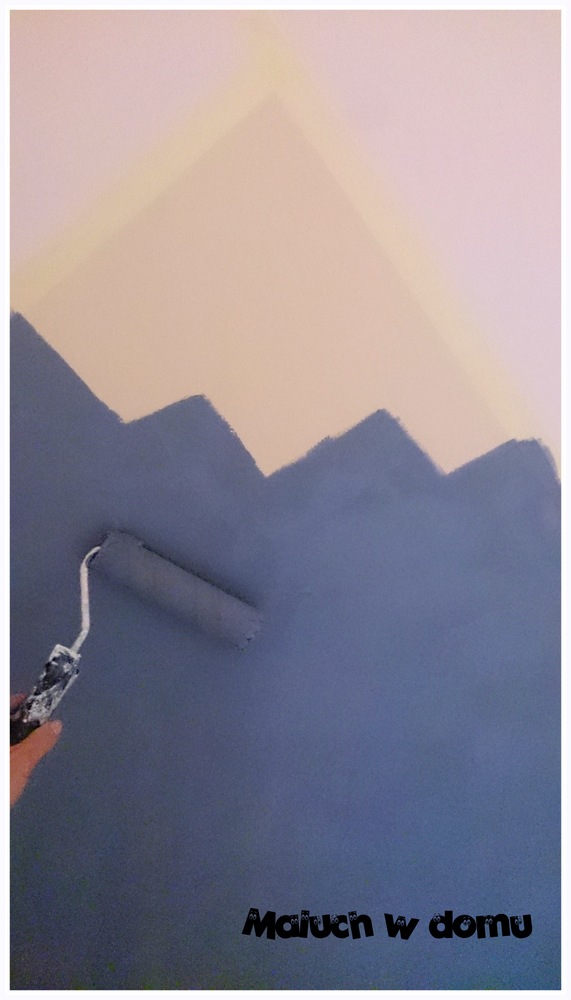 Malowanie tego „dzieła” należało do mnie. Najpierw zaznaczyłam taśmą układ gór. Ta, która jest z tyłu będzie jaśniejsza, więc zamalowałam ją jako pierwszą, pozostawiając trochę miejsca na wierzchołku na… „śnieg”. Od razu Was przepraszam, ale zdjęcia nie są zbyt dobrej jakości (robiłam je na szybko telefonem, a meble odcinały mi dopływ światła).
