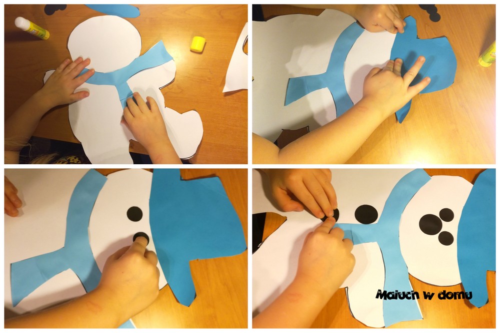 Następnie przyklejamy wszystko po kolei: szalik, kapelusz, oczy i guziczki.