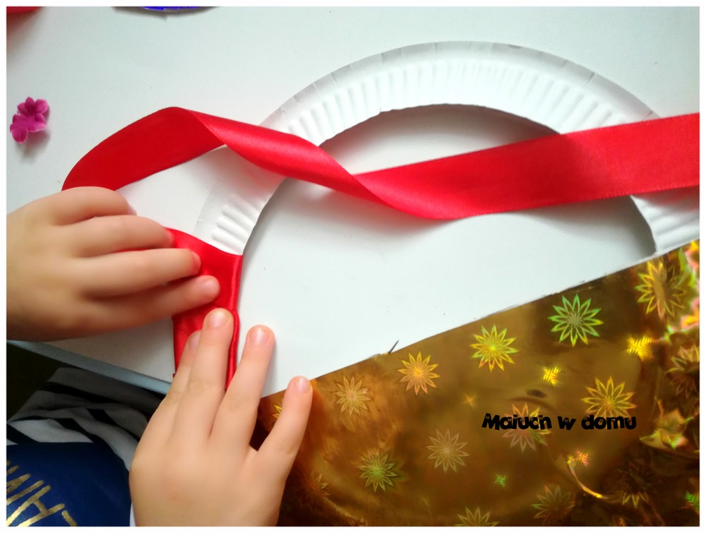 Rączkę owijamy równo wstążką w dowolnym kolorze. Na końcu możemy zrobić kokardkę.